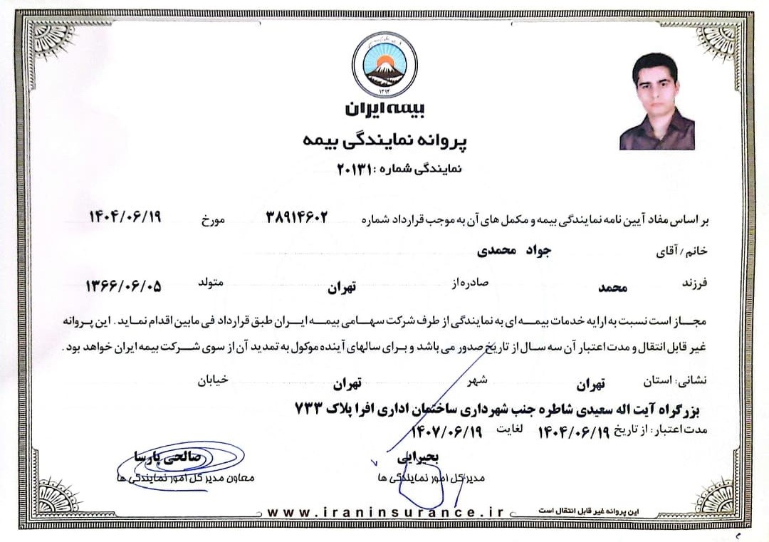 نمایندگی محمدی با کد اختصاصی 20131 در بیمه ایران توانسته است به پشتوانه حضور فعال و مستمر بیش از بیست سال در صنعت بیمه کشور و در سایه لطف الهی و حسن نظر و اعتماد بیمهگذاران محترم خود و همچنین به واسطه بهرهمندی از بهترین کارشناسان مجرب،تحصیل کرده و متخصص صنعت بیمه و نیز مشاوران حرفهای و نیز برخورداری از ارتباطات موثر با بدنه و مدیریت شرکت بیمه ایران،خدمتی شایسته به بیمهگذاران خود ارائه نماید.درست در تاریخ 1391/06/19 پس از سالها کسب تجربه،از دل تمامی اهداف و تجارب فعالیت رسمی و قانونی خود رو آغاز کرد